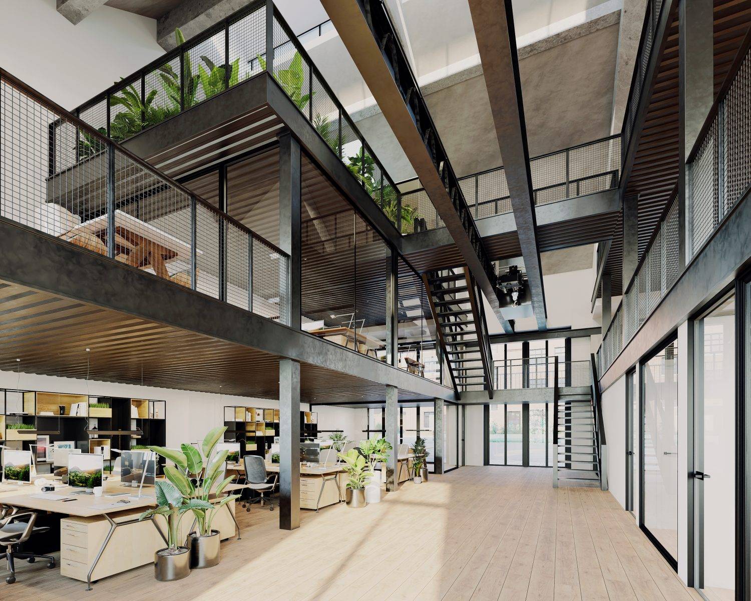 Im Zuge der Umbaumaßnahmen werden alle Zwischenebenen entfernt, die Fassade in ihrem Stahlbetonraster freigelegt und ein statisch unabhängiges in Holz-Fertigbauteilen bestehendes Gebäude im „Haus in Haus“ Prinzip intern errichtet. Dieser Neubau kann dadurch eine Energie Effizienzklasse 40 EE erreichen, ohne das Denkmalensemble zu beeinflussen. Die Ziegel aus dem abgebauten Schornstein werden recycelt und in der neuen Fassade wieder verwendet. Die historisch angepasste Doppelfassade dient als extra Wärmeschutz, passt sich den Nebengebäuden an und ist nicht sehr viel teurer als eine komplett neue Fassade, da die Abbruch-, Material- und Entsorgungskosten gespart werden kann. Auf dem großen Dach wird auf einer Fläche von ca. 600 m² eine große Photovoltaikanlage installiert. Diese versorgt sowohl die Wärmepumpe der Anlage im Winter und die Ladestationen im Sommer.