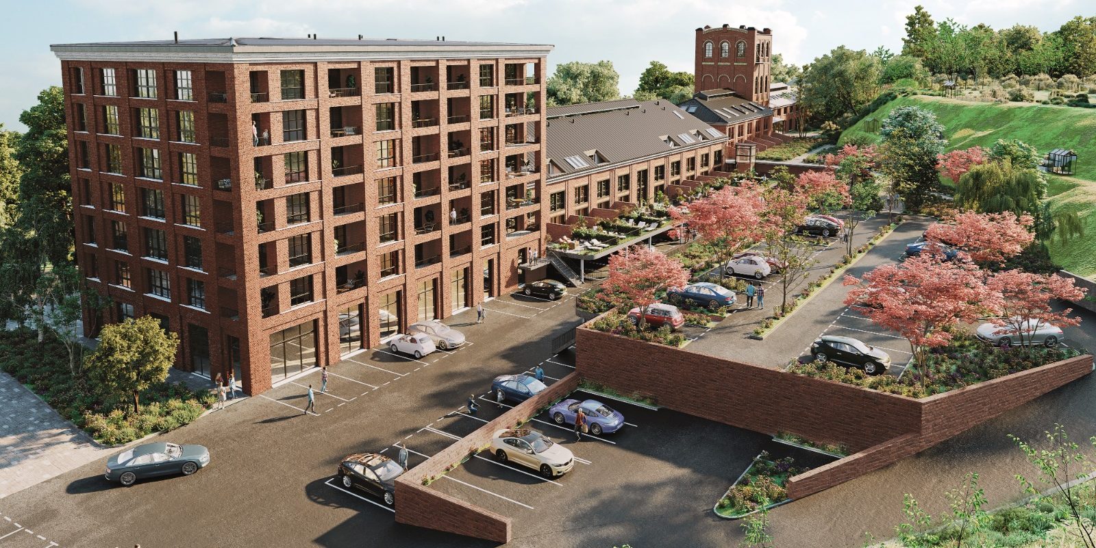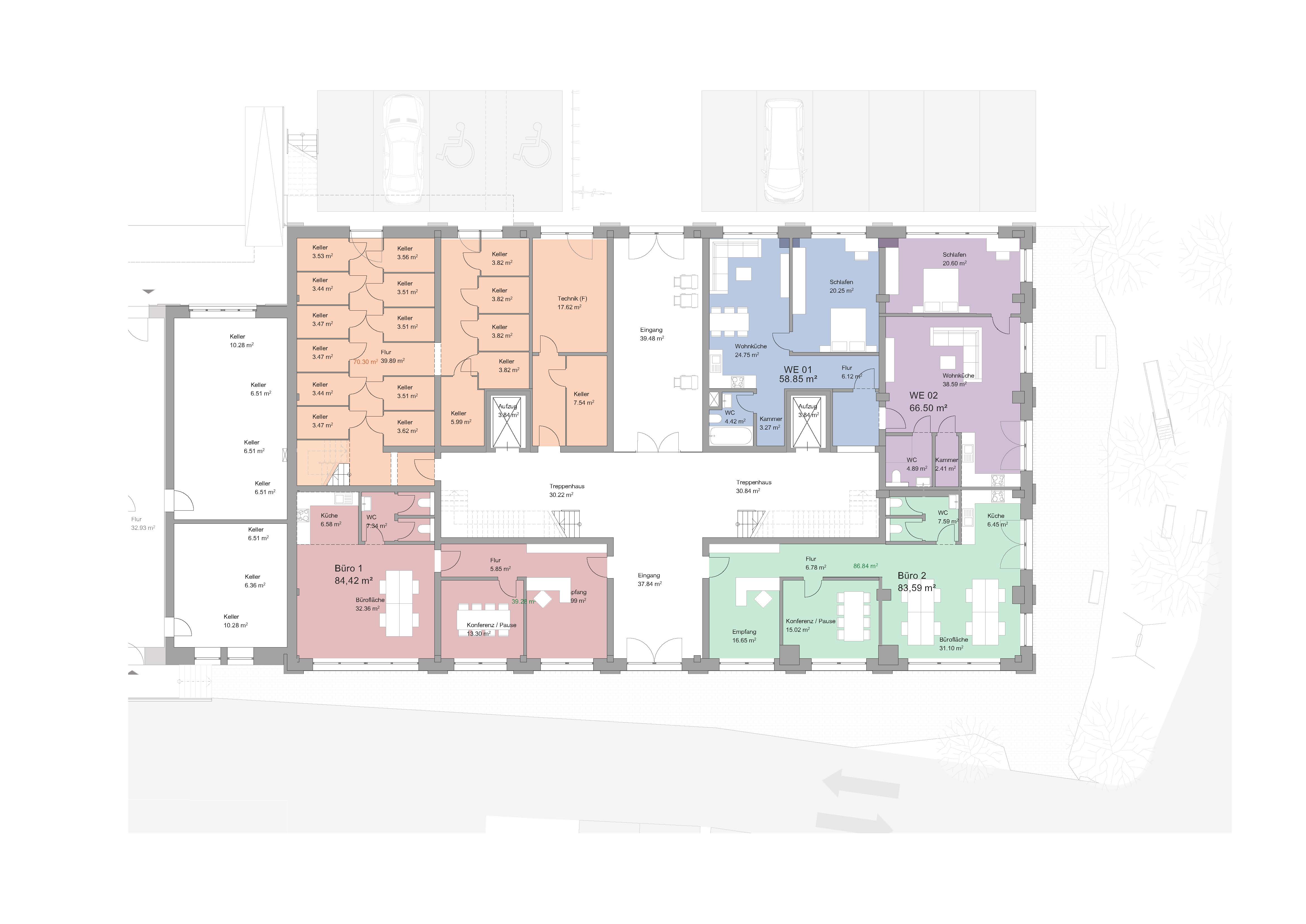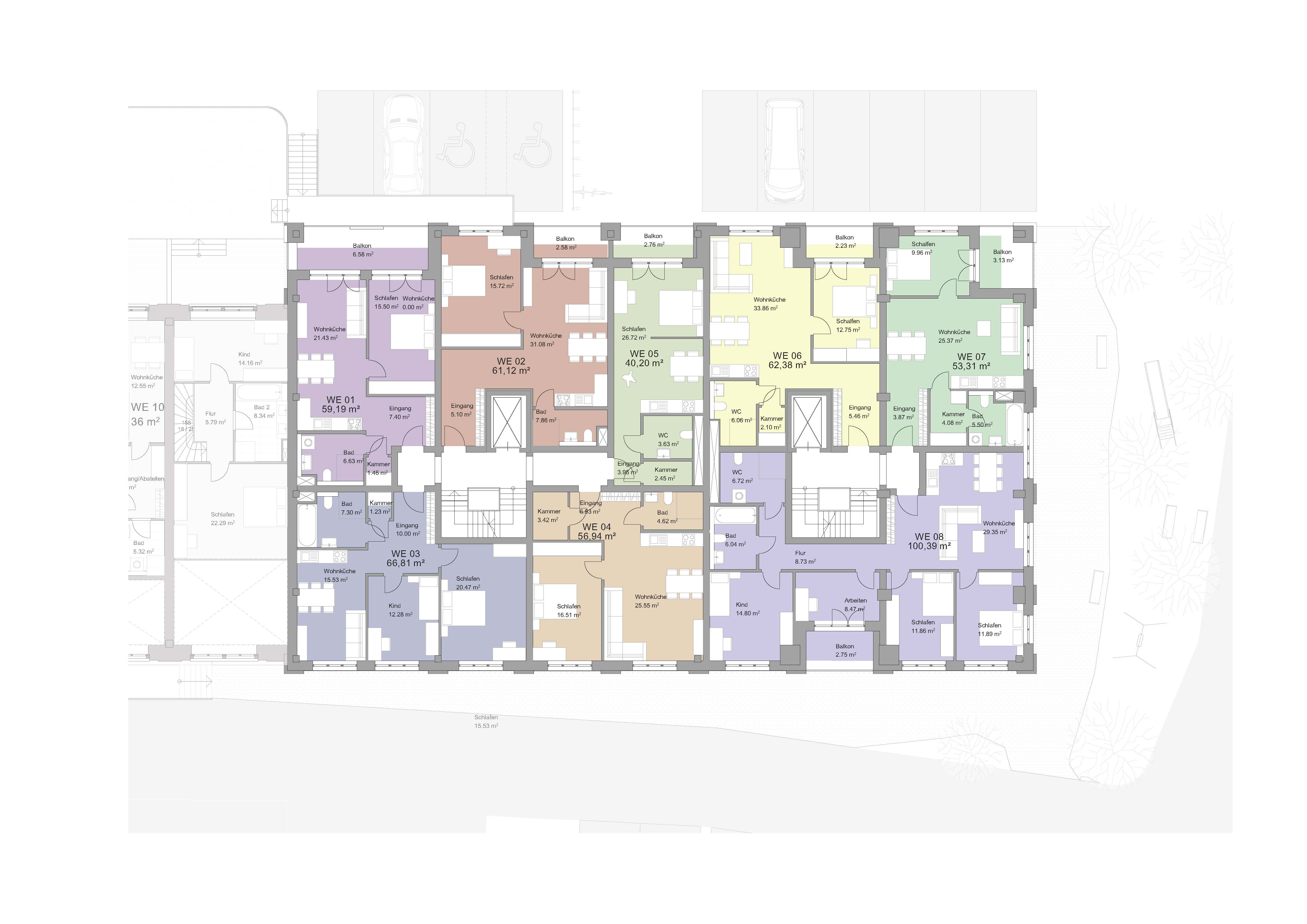 In dem Außenbereich der Kesselhauses entstehen ca. 50 PKW Parkplätze mit 10 Elektroladesäulen, 30 Fahrradstellflächen mit fest montierten Fahrradständern und 4 Motoradstellplätze.