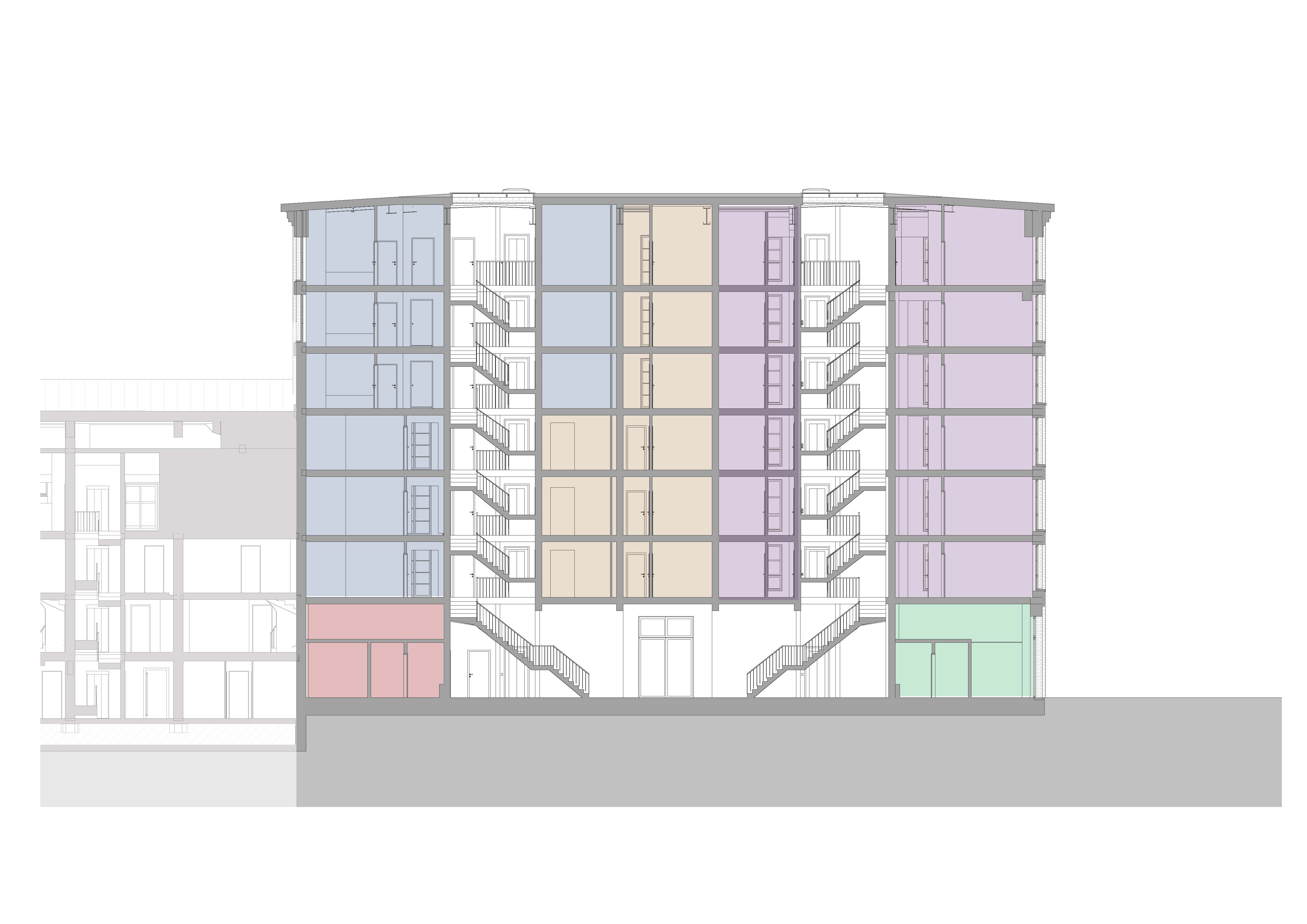 Im Gebäude selbst werden zwei Treppenhäuser mit je einem Personenaufzug eingebaut, die barrierefrei gestaltet sind und einen stufenlosen Zugang zu allen Gebäudeteilen ermöglichen.